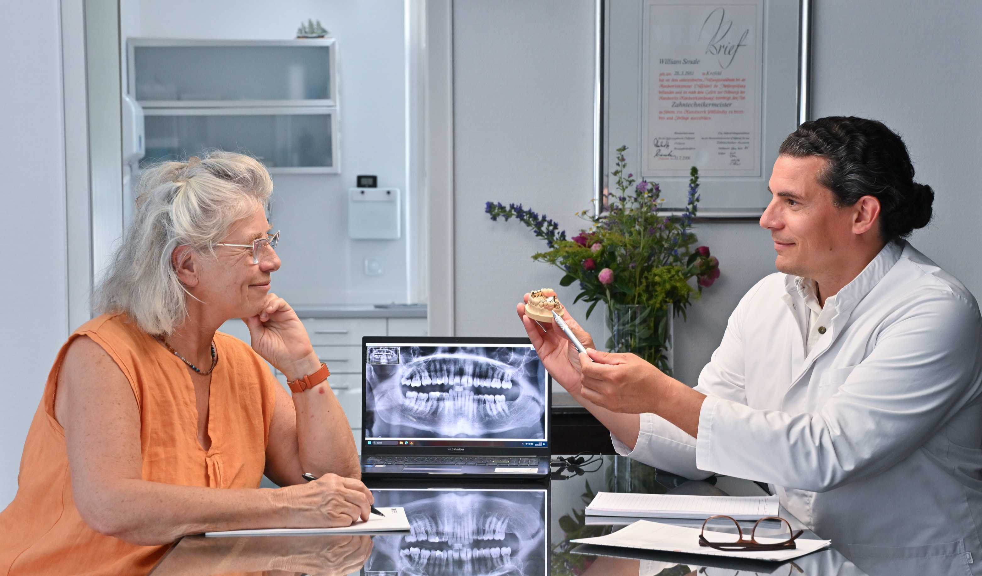 We don't offer dentures in a day, because we know how sensitive and complex the orofacial system is. To ensure perfect jaw positioning, we work with long-term temporary dentures that must prove themselves in everyday life before the final restoration is implemented.